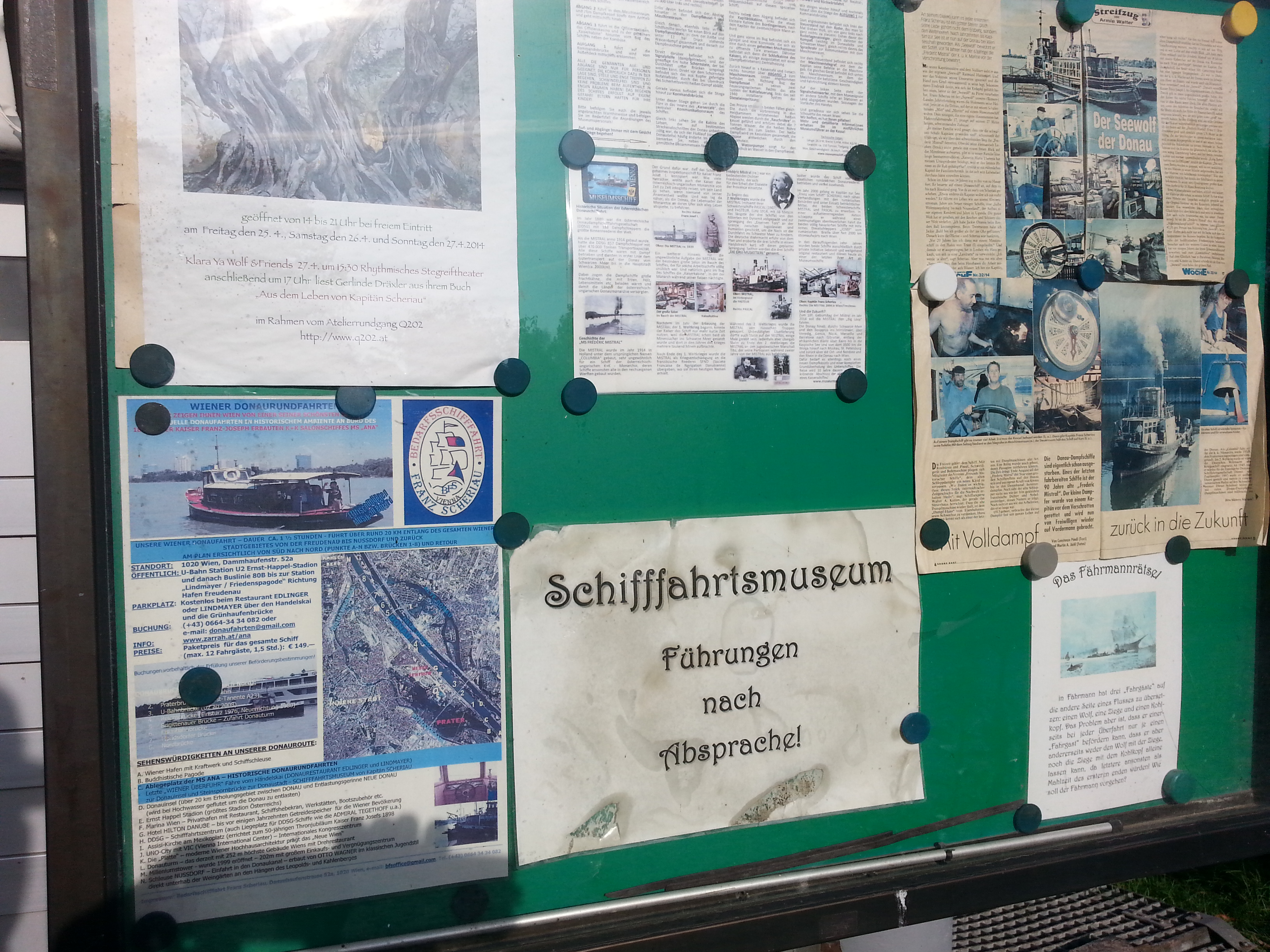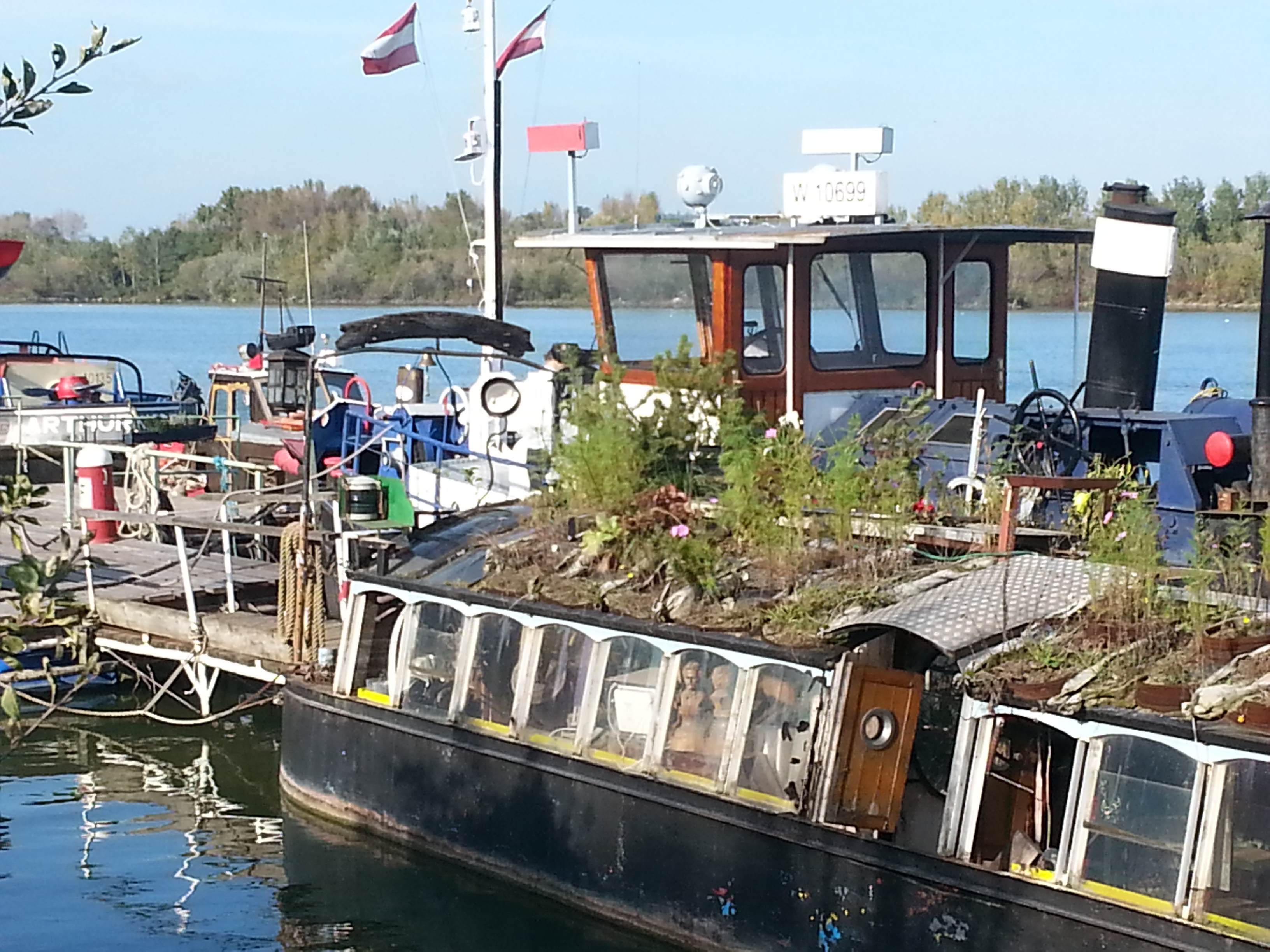 Eine kuriose Ansammlung alter Schiffe liegt in der Freudenau vor Anker. Nicht im Hafen Freudenau, sondern direkt auf der Donau, leicht zu erreichen am Spazierweg vor der Pagode. Aus dem Hafen Freudenau wurde der Eigentümer mitsamt seiner Flotte angeblich hinauskomplimentiert. Vor kurzem gab es einen ganzen Bericht auf ORF über den ehemaligen Kapitän und Sammler alter Schiffe.