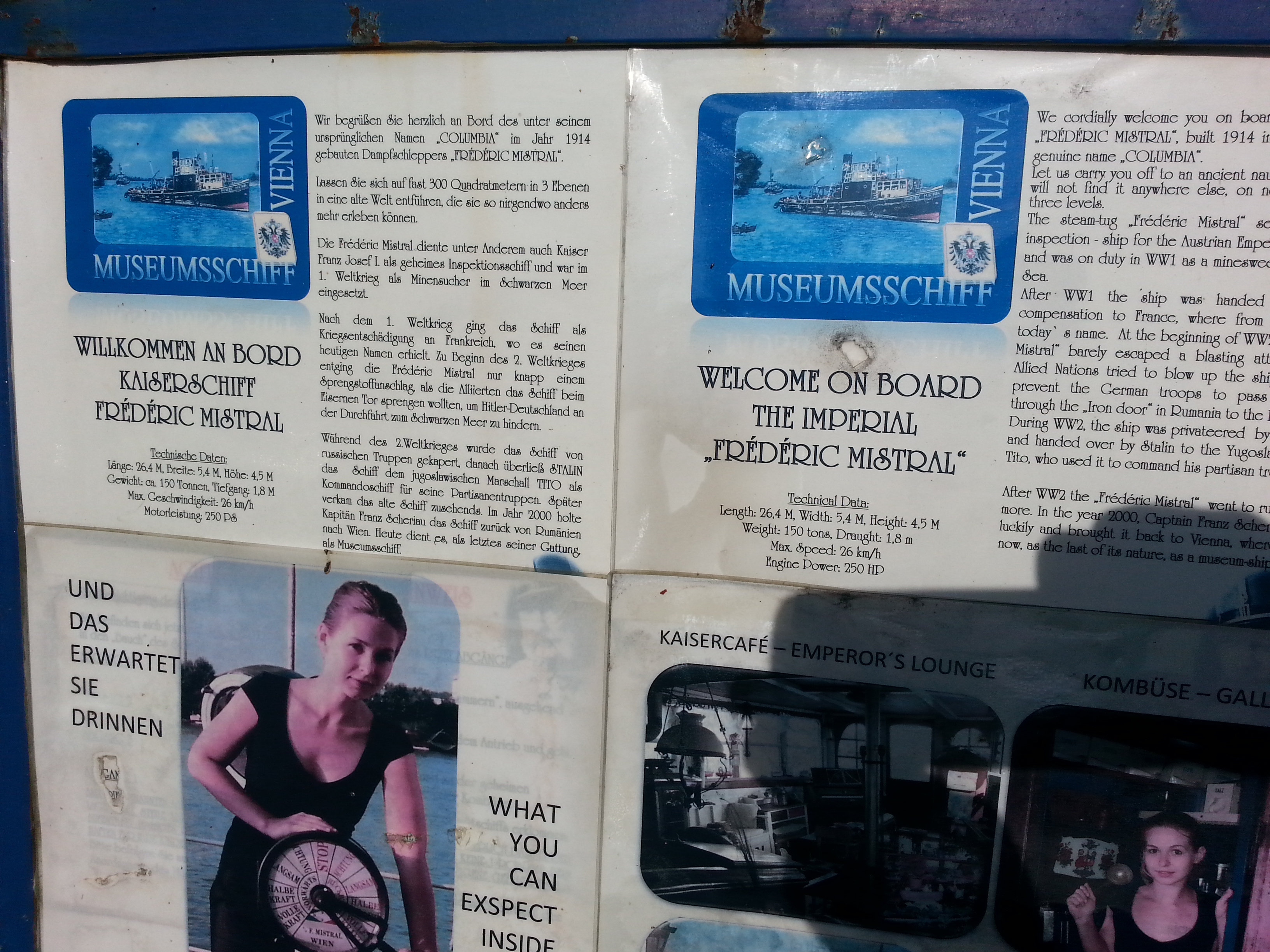 Auf einem der Boote wohnt der Kapitän selbst, zu besichtigen bzw. zu mieten sind alle (?), wie z. B: das historische Salonboot Ana oder das Kaiserschiff Frédéric Mistral. Offenbar in Eigenregie werden die historischen Schiffe restauriert und hängen nur am Donauufer und warten auf Besucher.