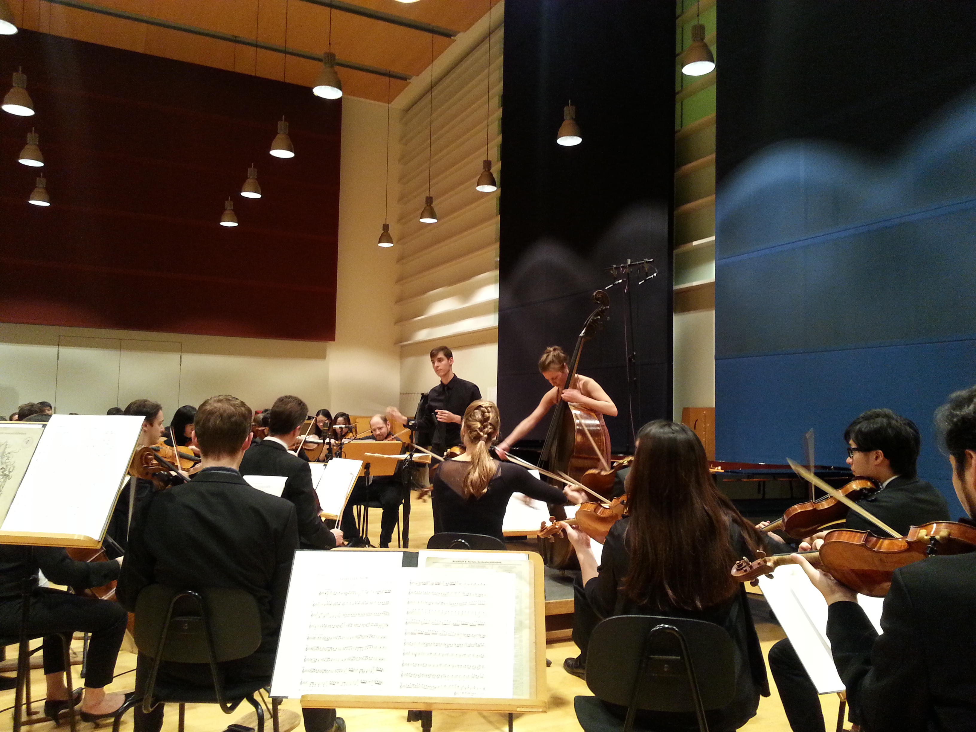 Zwei weitere Studenten von Mark Stringer traten davor auf. Der Amerikaner Benjamin Grobman (mit einem Satz aus einer Haydn-Symphonie und dem 1. Satz aus Mozarts Konzert für 2 Klaviere und Orchester Nr. 10) sowie der junge ungarisch-polnische Dirigent Marcell Denes-Worowski, der ein Konzert für Kontrabass und Orchester von Giovanni Bottesini leitete.