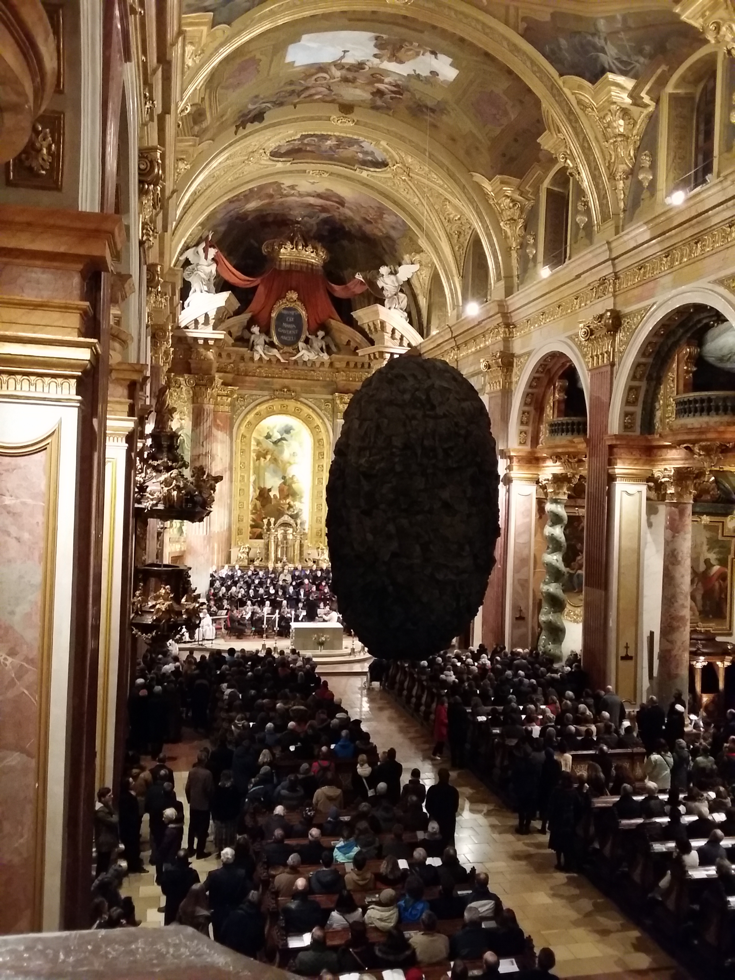 Ob es eine gelungene Kunstintervention ist, davon sollte man sich selbst ein Bild machen. Mir ist das Riesending mitten im Kirchenraum zu dominant, es blockiert den Blick auf den Hochaltar und mindert das gesamte Raumgefühl. Aber Mut kann man den Jesuiten, in diesem Fall v.a. Georg Schörghofer, Kunsthistoriker und Rektor der Jesuitenkirche, nicht absprechen, denn für Diskussionsstoff ist gesorgt.