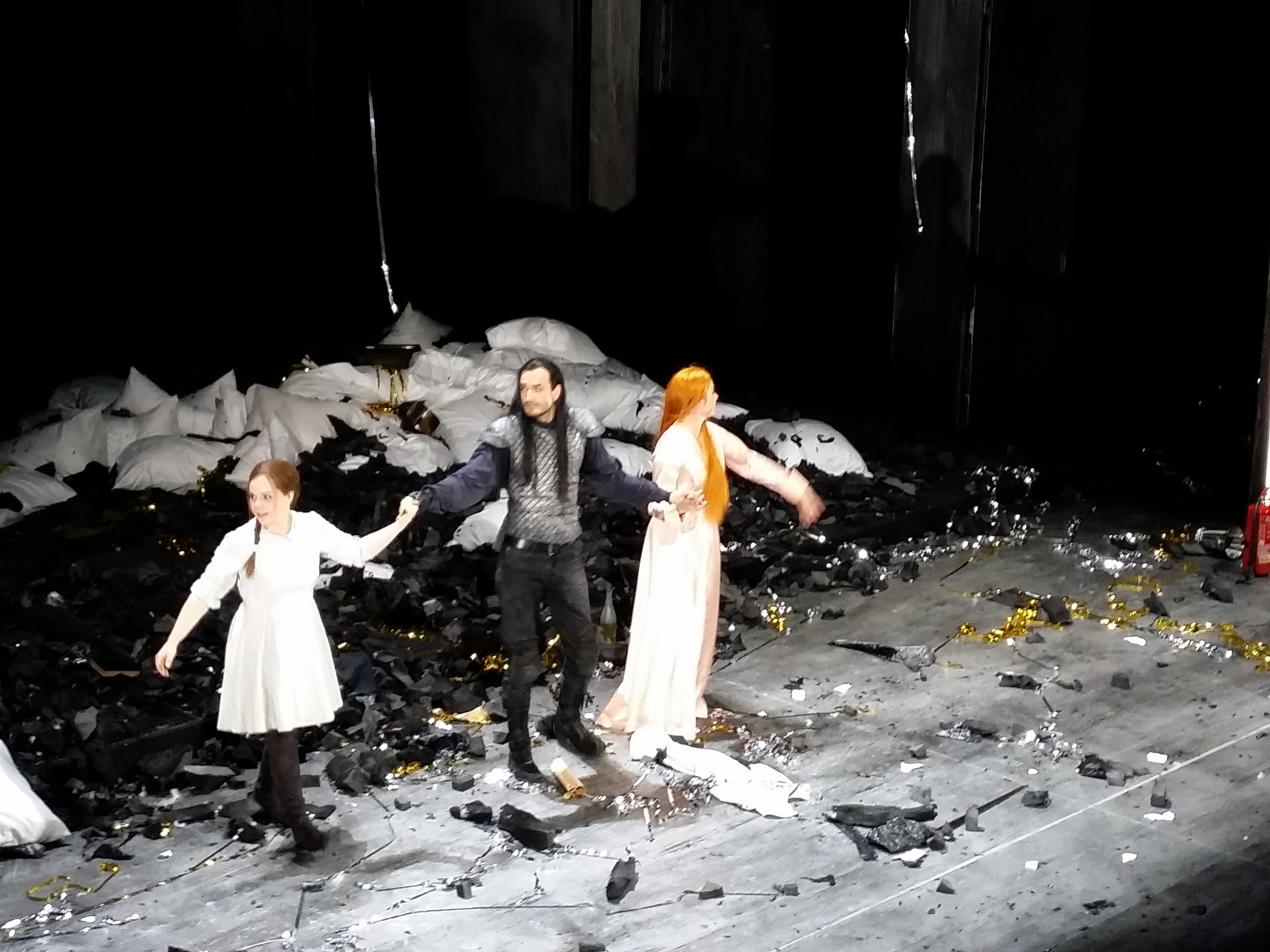 Die sehr kühle Inszenierung lässt manchmal Platz für romantische Momente, auch komische Szenen dürfen sein, aber deshalb wird die Story nicht einleuchtender. Durchwegs gut gespielt (Sarah Viktoria Frick als Käthchen, Fabian Krüger als Wetter vom Strahl, Dörte Lyssewski als Kunigunde, Martin Schwab als Kaiser, Falk Rockstroh als Käthchens Vater) und wie schon erwähnt in einem tollen Bühnenbild, fehlt mir am Ende doch etwas. Ich glaube, es ist die Figur des Käthchens, die zeitweise wie aus dem „Exorzist“ entsprungen oder wie ein störrisches Kind wirkt und so gar nichts Mädchenhaftes oder „Liebreizendes“ an sich hat. Aber gerade diese Sichtweise hat vielen anderen wiederum gut gefallen.