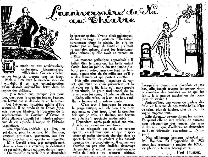 Im Pariser Etablissement „Le Divan Japonais“ stand im März 1984 „Le Coucher d’Yvette“ auf dem Programm. Der Vorhang hob sich, der Blick auf ein Schlafzimmer wurde freigegeben und die Darstellerin Blanche Cavelli trat in Tageskleidung auf. Doch dann begann sie langsam, ein Kleidungsstück nach dem anderen abzulegen und sich für die Nacht zurechtzumachen – bei den Unmengen an Unterwäsche im 19. Jahrhundert sicher eine längere Angelegenheit. Was das Publikum geboten bekam, war der erste historisch dokumentierte Striptease auf einer Bühne.