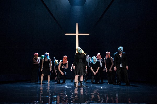 Auf einer ganz reduzierten schwarzen Bühne, die nur durch ein Riesenkreuz im Hintergrund erleuchtet wird und auf der ansonsten der ganze Boden unter Wasser steht, arbeiten sich die Schutzbefohlenen (=Flüchtlinge) nach vorne. Mit Masken, die nur manchmal abgelegt werden, um ein wenig Persönlichkeit zu zeigen.