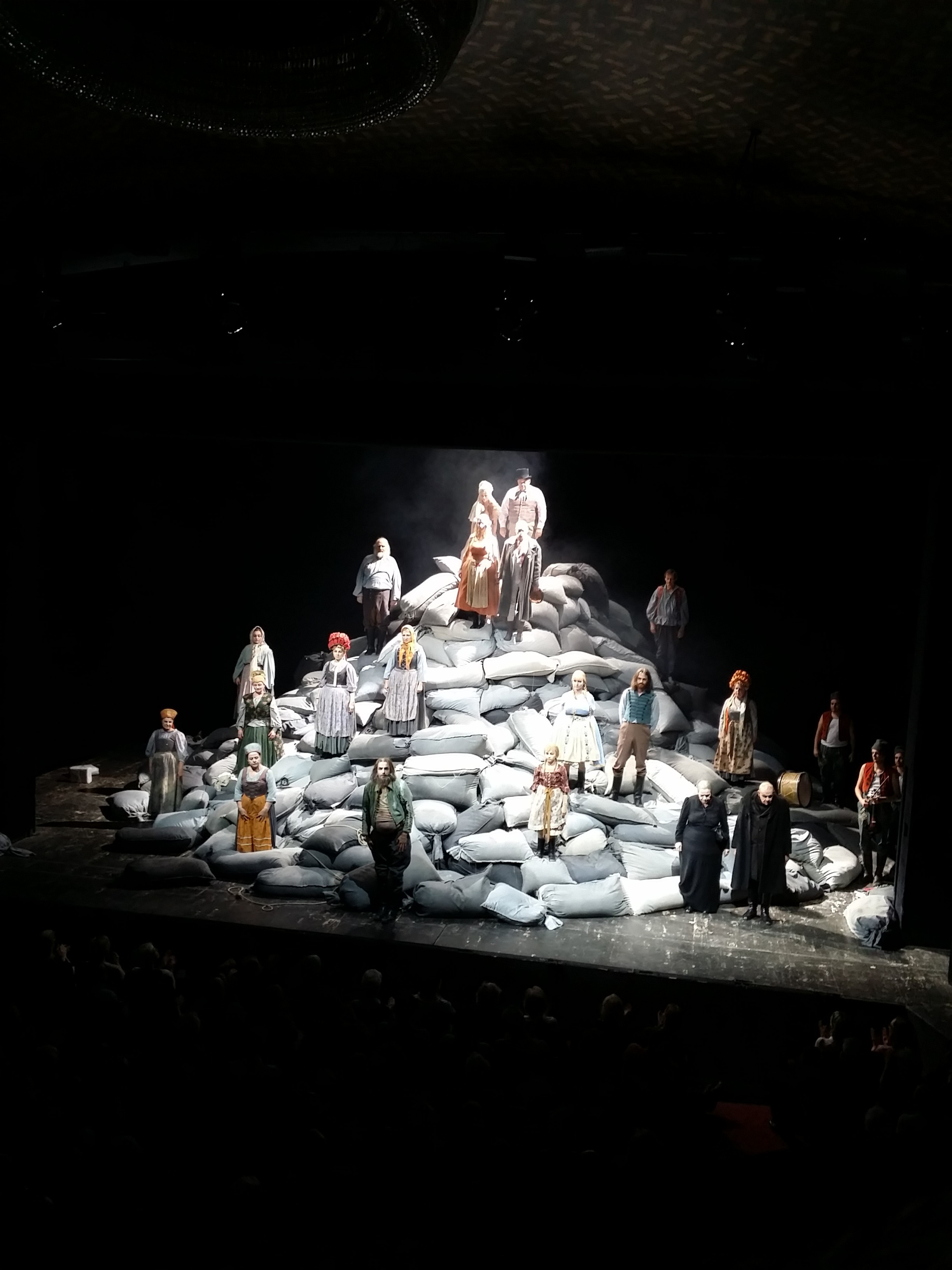 Ich gebe es zu: Von Leo Tolstois Theaterstück „Die Macht der Finsternis“ – aktuell im Akademietheater in Wien – habe ich vorher noch nie etwas gehört. Gierige Bauern und ihre liederlichen Knechte, mordende Bäuerinnen, verrückte Mädchen: Das ist das Personal in diesem Stück, das tief in die menschlichen Abgründe blicken lässt. Umso höher baut sich das Bühnenbild aus grauen Säcken auf, wirklich imposant entstehen schöne monochrome Bilder, die am Ende mit einer folkloristischen Hochzeit gefärbt werden.
