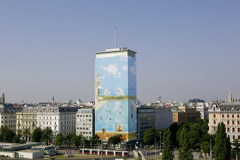 Seit gestern präsentiert sich der Ringturm zum 60-Jahr-Jubiläum mit der neuen Verhüllung – diese Saison von der kroatischen Künstlerin Tanja Deman gestaltet. Der Titel „Sommerfreuden“ ist Programm, innen wie außen. Außen wird der Blick auf einen Riesenpool gelenkt, in dem lustiges Treiben herrscht. Gefällt mir in der realitätsnahen Darstellung eigentlich weniger, ich finde in dieser Dimension Abstraktes schöner.