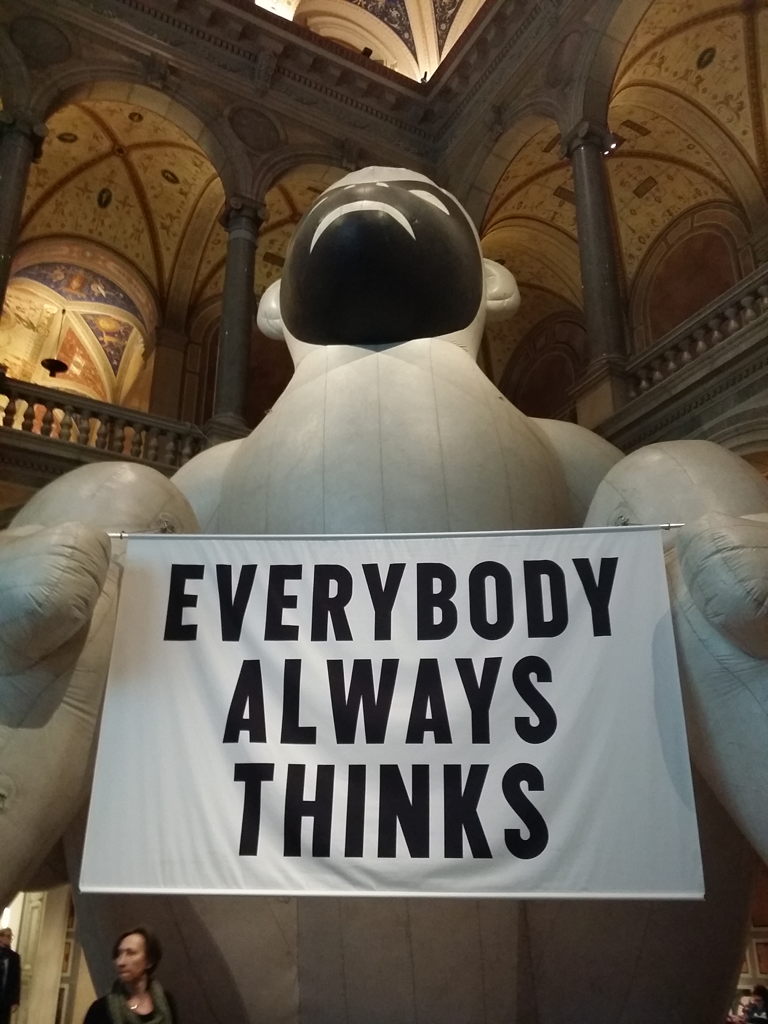 Dazwischen tolle Filme und Bilder, die sich oft anders entwickeln als erwartet. Auch die WCs und Lifttüren sind ins Ausstellungskonzept einbezogen – also auch dort einen Besuch einlegen.