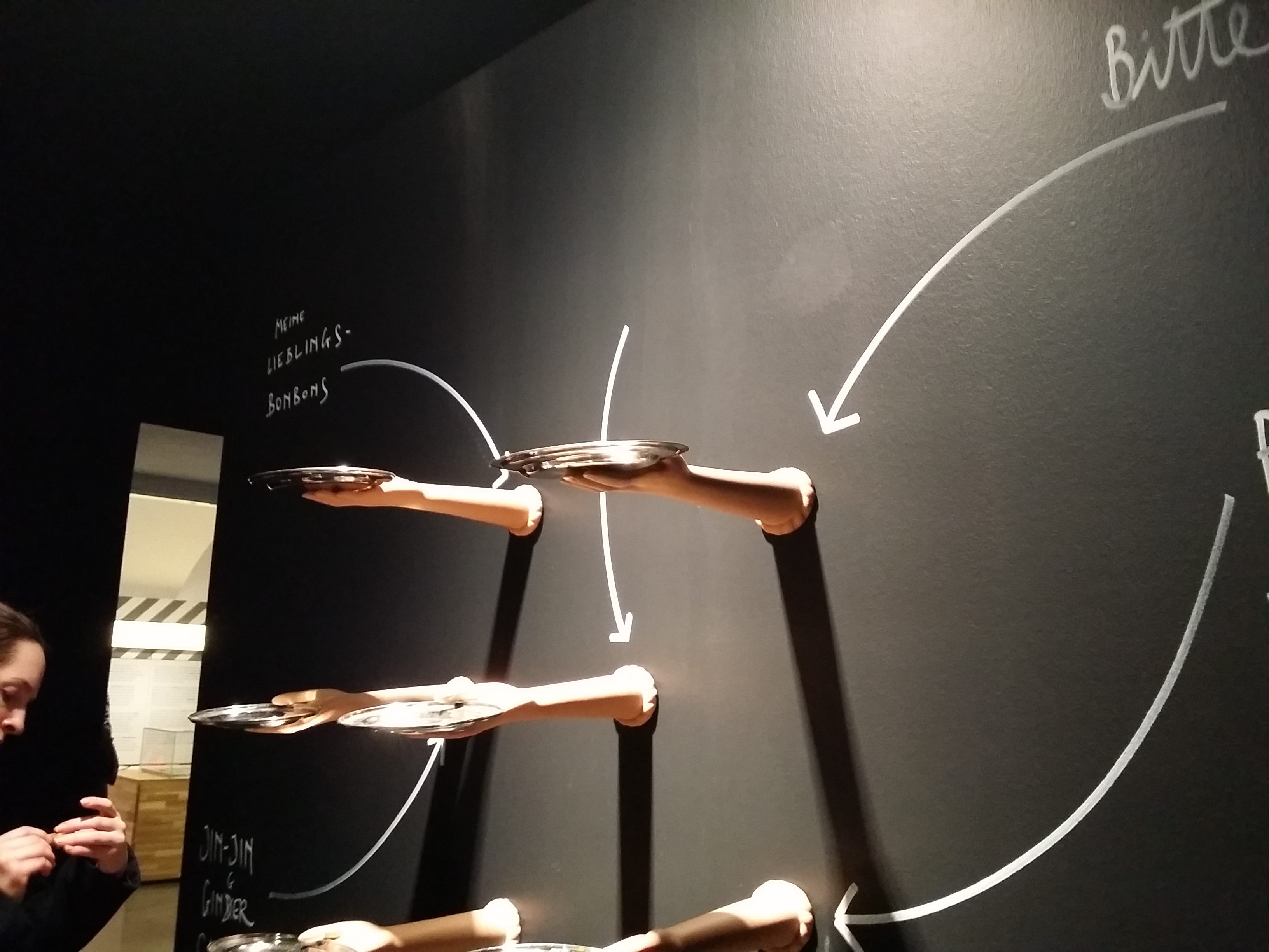 An vielen Stellen werden die Besucher aufgefordert, etwas zu tun, etwas mitzunehmen oder etwas zu zeichnen. Nicht alle interaktiven Spielereien sind wirklich neu, aber trotzdem ist es lustig, mitzumachen oder zumindest zuzuschauen. Man kann Münzen aufklauben, die andere Besucher in ein Rohr im 1. Stock geworfen haben oder angebotene Ingwerzuckerln und Kaugummis naschen. Oder man soll ein glückliches Tier zeichnen, das dann in dem Video „Animal Parade“ landen könnte.