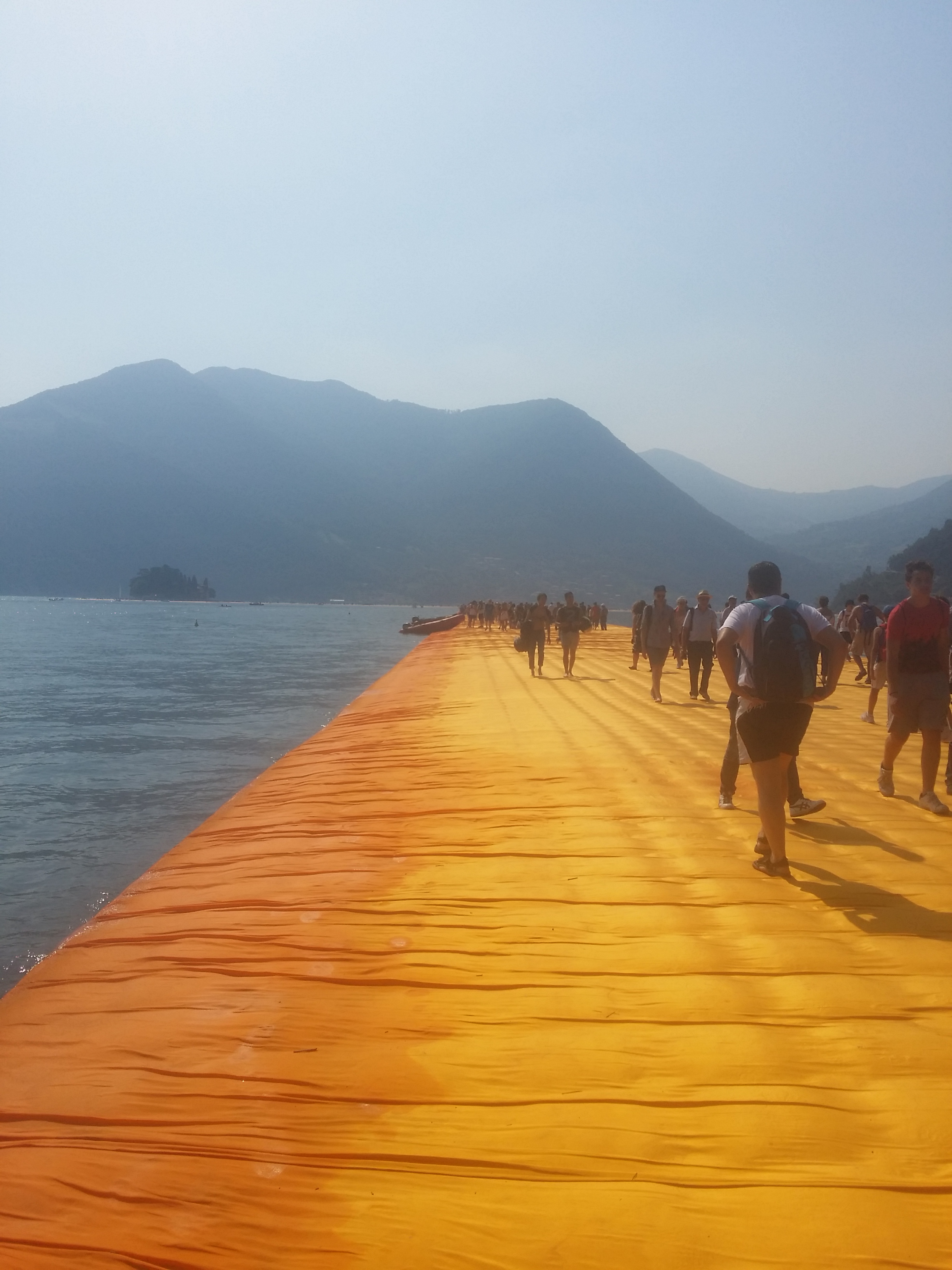 Schon beim Anflug auf Mailand konnte ich die „Floating Piers“ bei strahlendem Sonnenschein aus dem Flugzeug sehen – beeindruckend! Es hat sich dann auch bestätigt: Das Gefühl, auf den leicht schwankenden, golden leuchtenden Pontons über den See zu spazieren, ist natürlich einmalig.