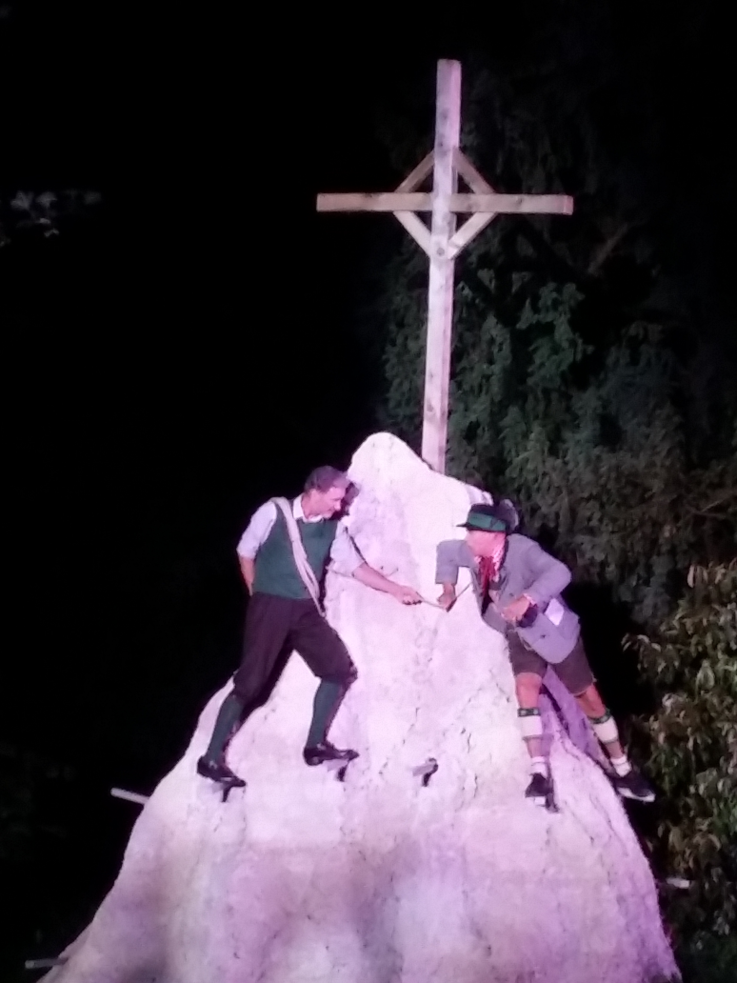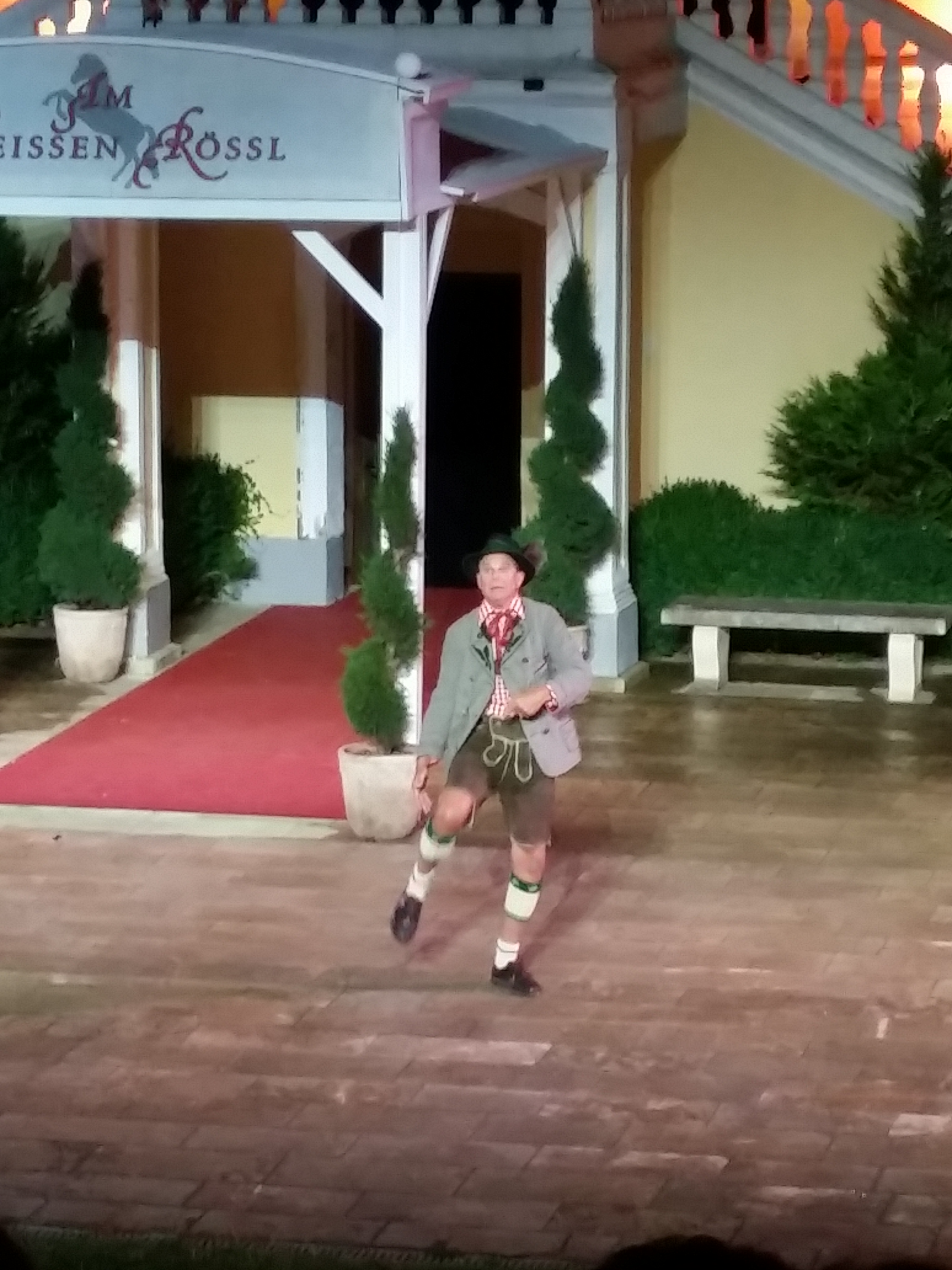 Es beginnt auch wirklich schwungvoll, in einem sehr schönen Bühnenbild vor der Schlossfassade. Die Rößlwirtin (Kristina Bangert, naja) und ihr Zahlkellner Leopold (sehr gut) liefern sich ein Liebesduell, bis am Ende jeder und jede richtig verbandelt ist. Dazwischen wird geschuhplattelt und gejodelt, der schöne Sigismund  und andere dürfen einen Berg erklimmen und der Chor ist auch tänzerisch gut drauf. Ein guter Teil der Gags kommt aus den Missverständnissen zwischen Deutschen (Johannes Seilern als Wilhelm Giesecke) und Österreichern, und da hat sich nicht viel geändert seit der Uraufführung im Jahr 1930 (in Berlin!).