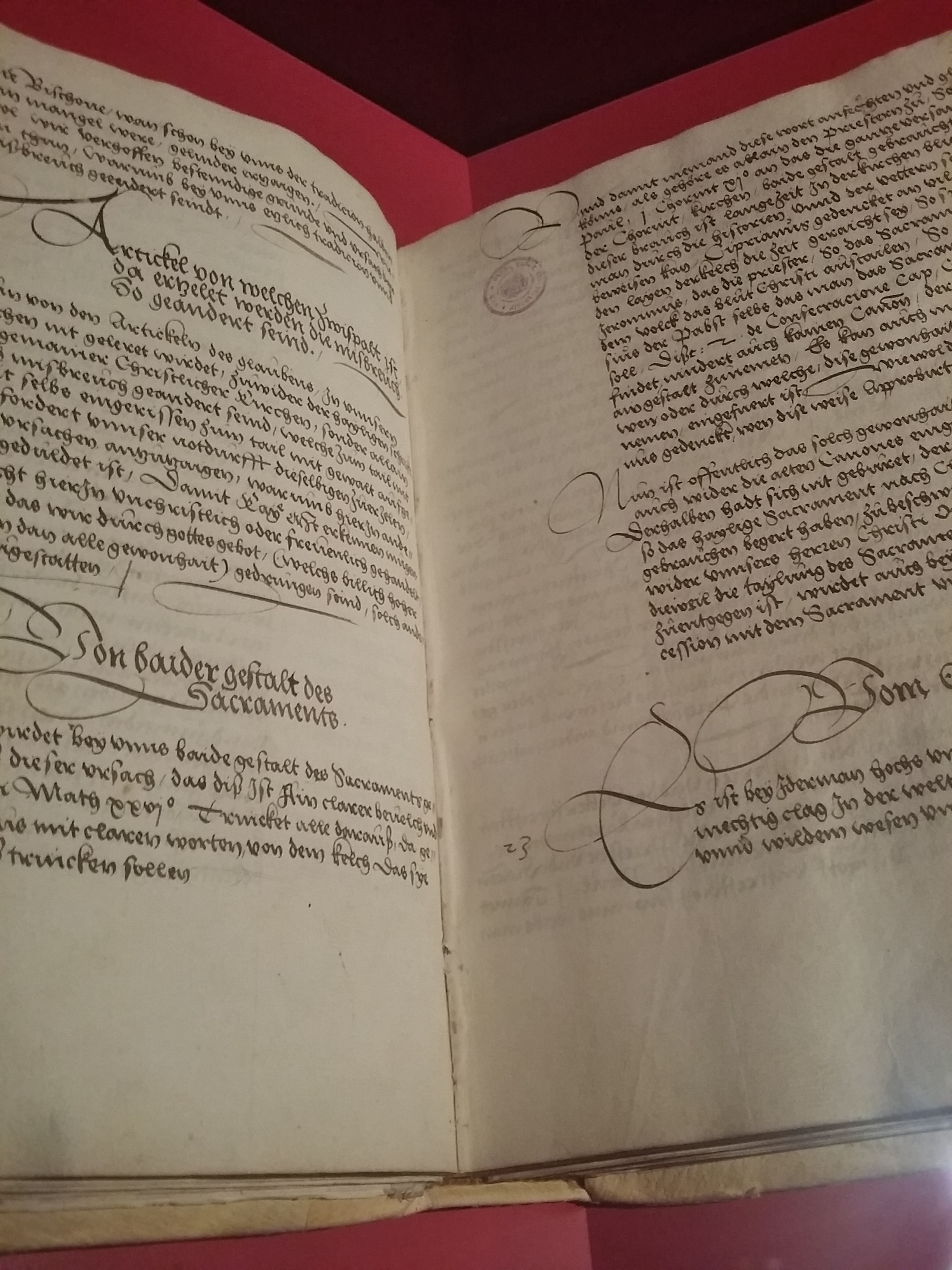 Denn es wäre schade, durch diese Ausstellung schnell durchzuhetzen und sich nicht mit den wertvollen Originaldokumenten zu befassen, die in dieser Zusammenstellung noch nie zu sehen waren: So wird einer von wenigen erhaltenen Erstdrucken der Thesen Luthers von 1517 gezeigt, das Augsburger Bekenntnis von 1530 in der ältesten Abschrift in deutscher Sprache sowie das Originaldokument des Augsburger Religionsfriedens von 1555 mit der Unterschrift Ferdinands I.. Aber keine Angst, die Ausstellung besteht nicht nur aus sogenannter „Flachware“, sondern die dramatischen Jahre werden mit Gemälden, Stichen und anderen Kunst- und Alltagsobjekten dargestellt.