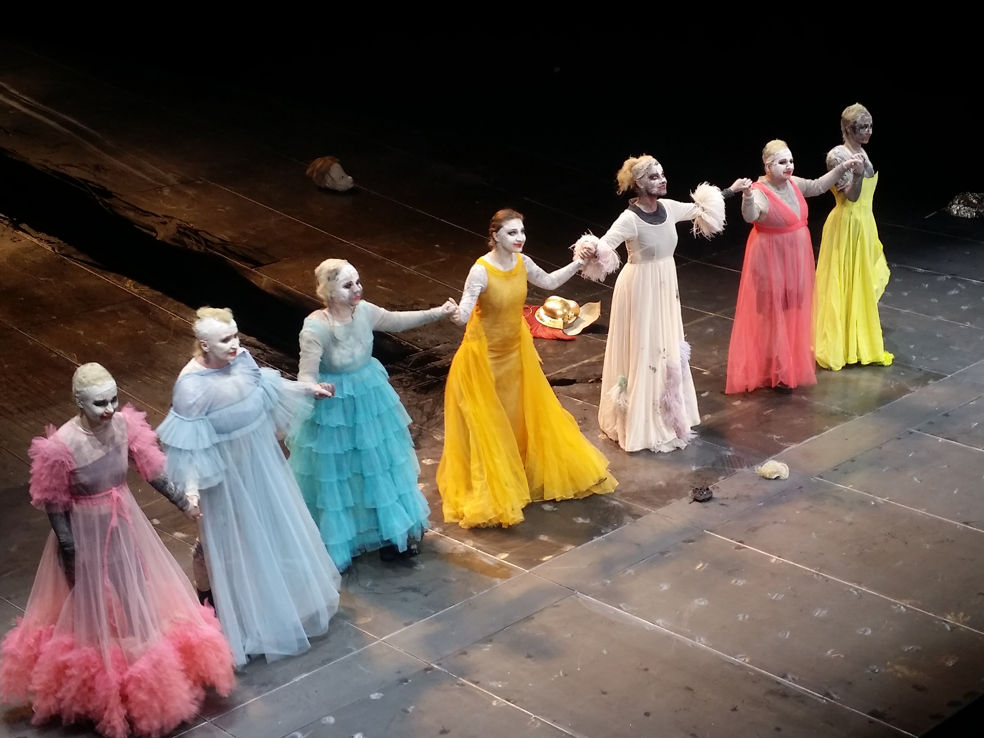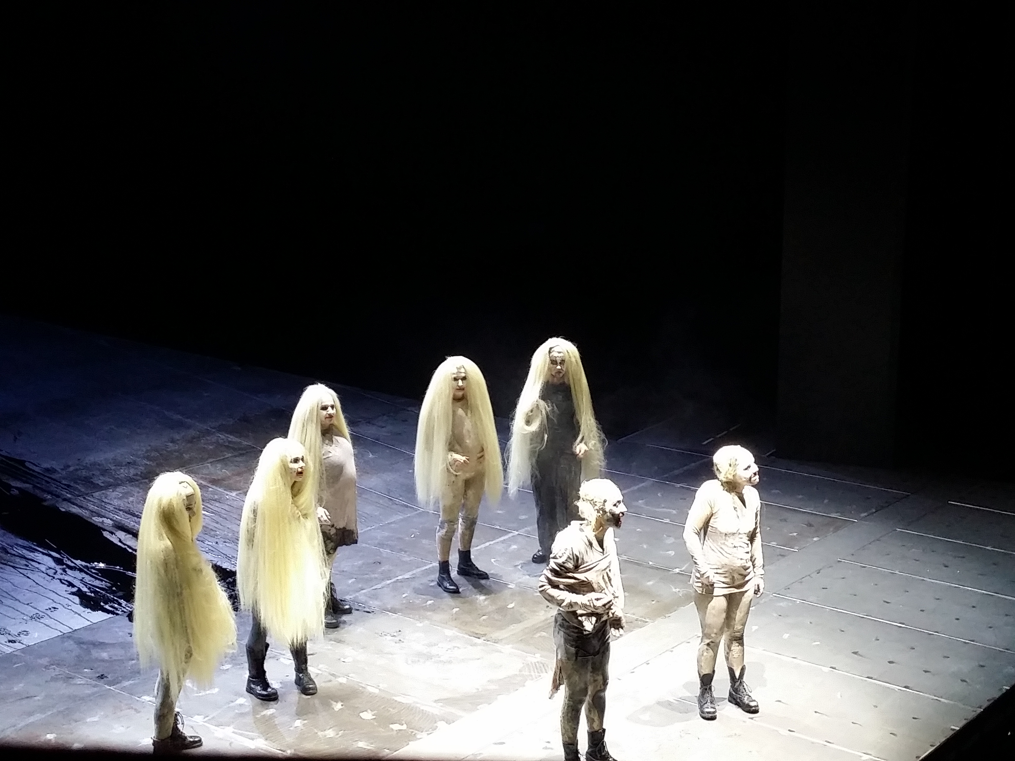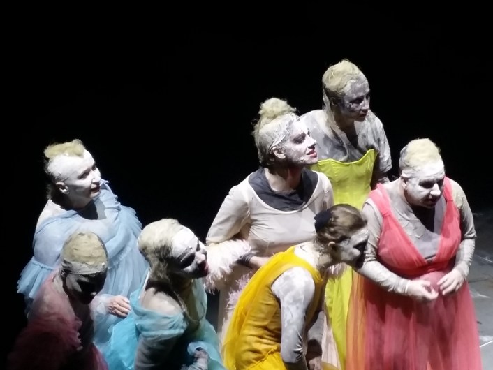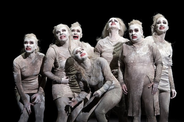 Der Chor besteht am Burgtheater aus sieben Frauen (Caroline Peters, Maria Happel, Andrea Wenzl, Barbara Petritsch, Aenne Schwarz, Sarah Viktoria Frankl und Irina Sulaver), kaum zu unterscheiden in den weißen Lumpen und Masken. Zusätzlich schlüpft jede von ihnen noch in eine der wichtigsten Rollen der Tragödie. Eine großartige Leistung, auch wenn die Exaktheit des Chores im Laufe der Aufführung etwas nachlässt, denn der Text ist eben kein einfacher.