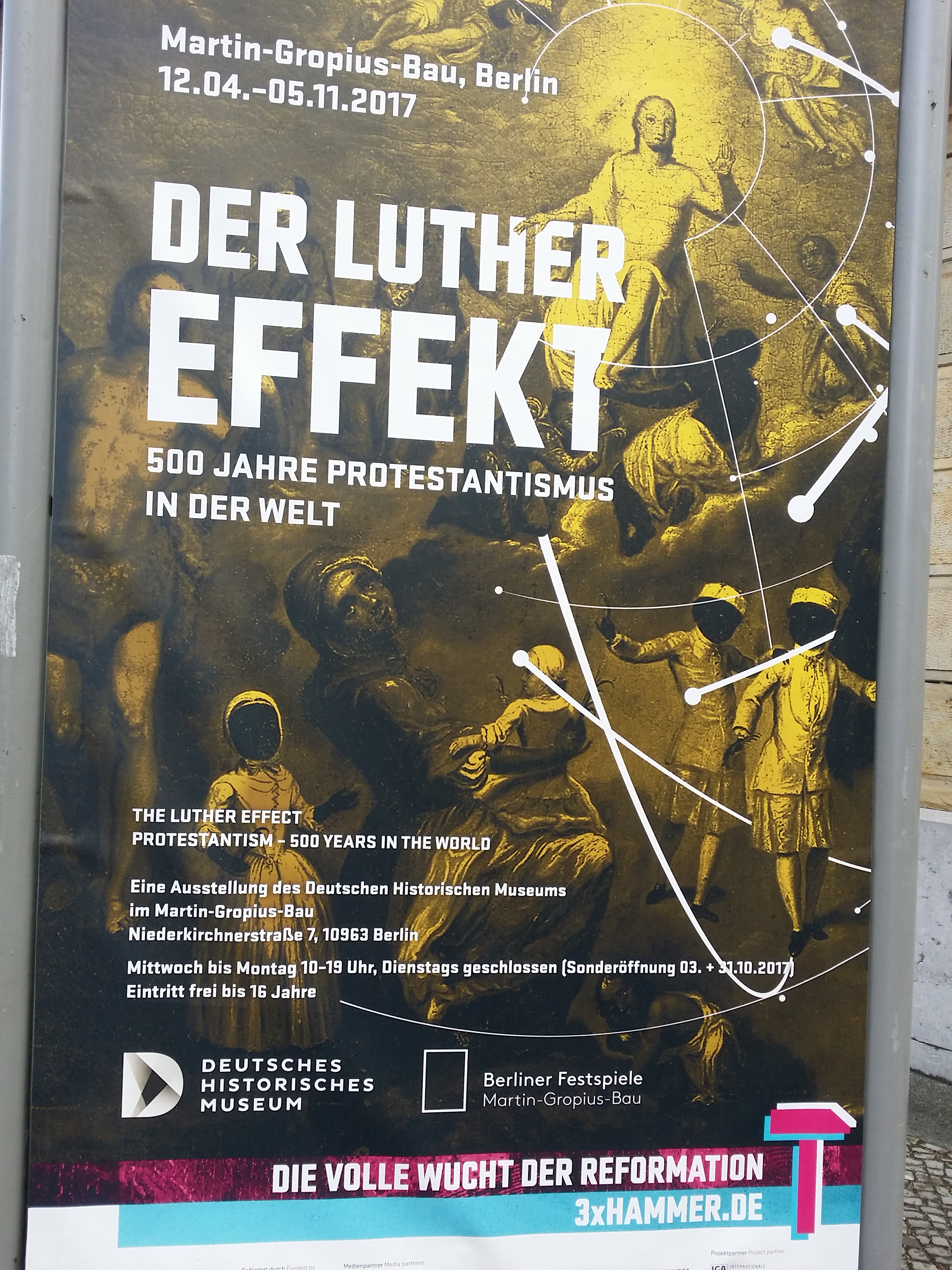 Hagel, Regen, Eiseskälte in Berlin über die Osterfeiertage – da bleibt ja fast nur der Weg ins Museum. Die Wahl fiel auf den Martin-Gropius-Bau, das frühere Kunstgewerbemuseum (das sowohl von der inhaltlichen Ausrichtung als auch dem architektonischen Stil dem Wiener Museum für Angewandte Kunst sehr ähnlich war/ist). Das Deutsche Historische Museum zeigt dort eine große Sonderausstellung zum Reformationsjubiläum: „Der Luthereffekt. 500 Jahre Protestantismus in der Welt“. Die beiden Partnerausstellungen „Luther und die Deutschen“ und „Luther! 95 Schätze – 95 Menschen“ sind vom 4. Mai auf der Wartburg in Eisenach beziehungsweise ab 13. Mai im Wittenberger Lutherhaus zu sehen.