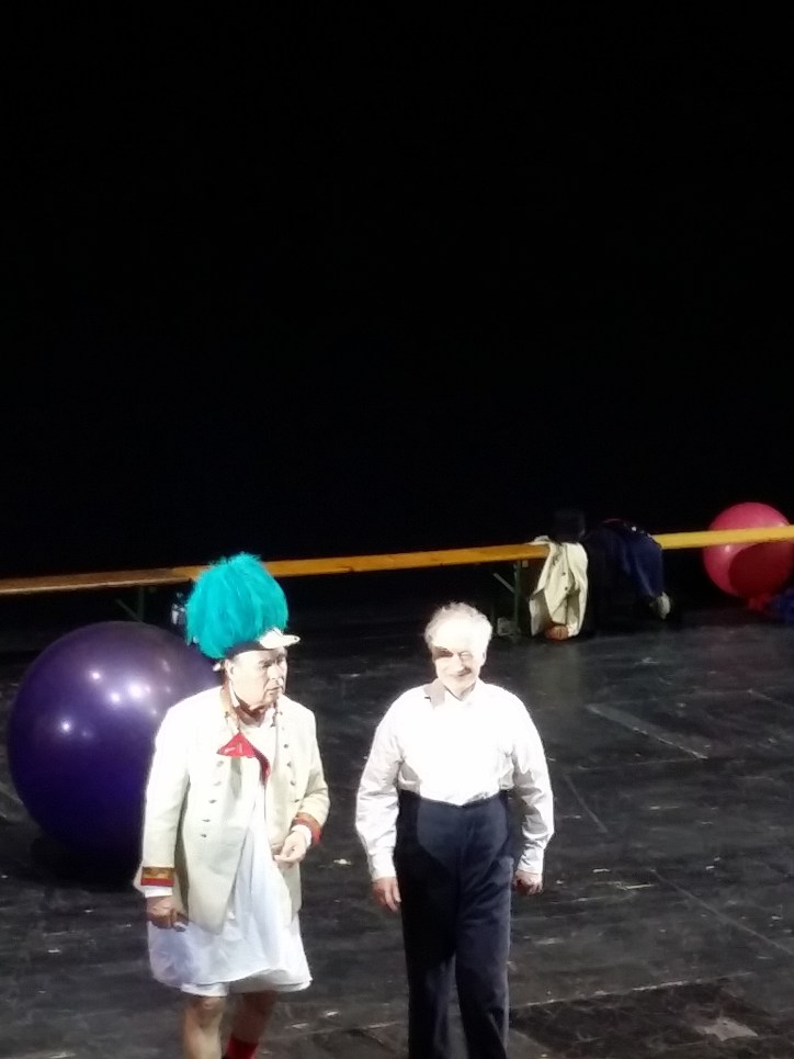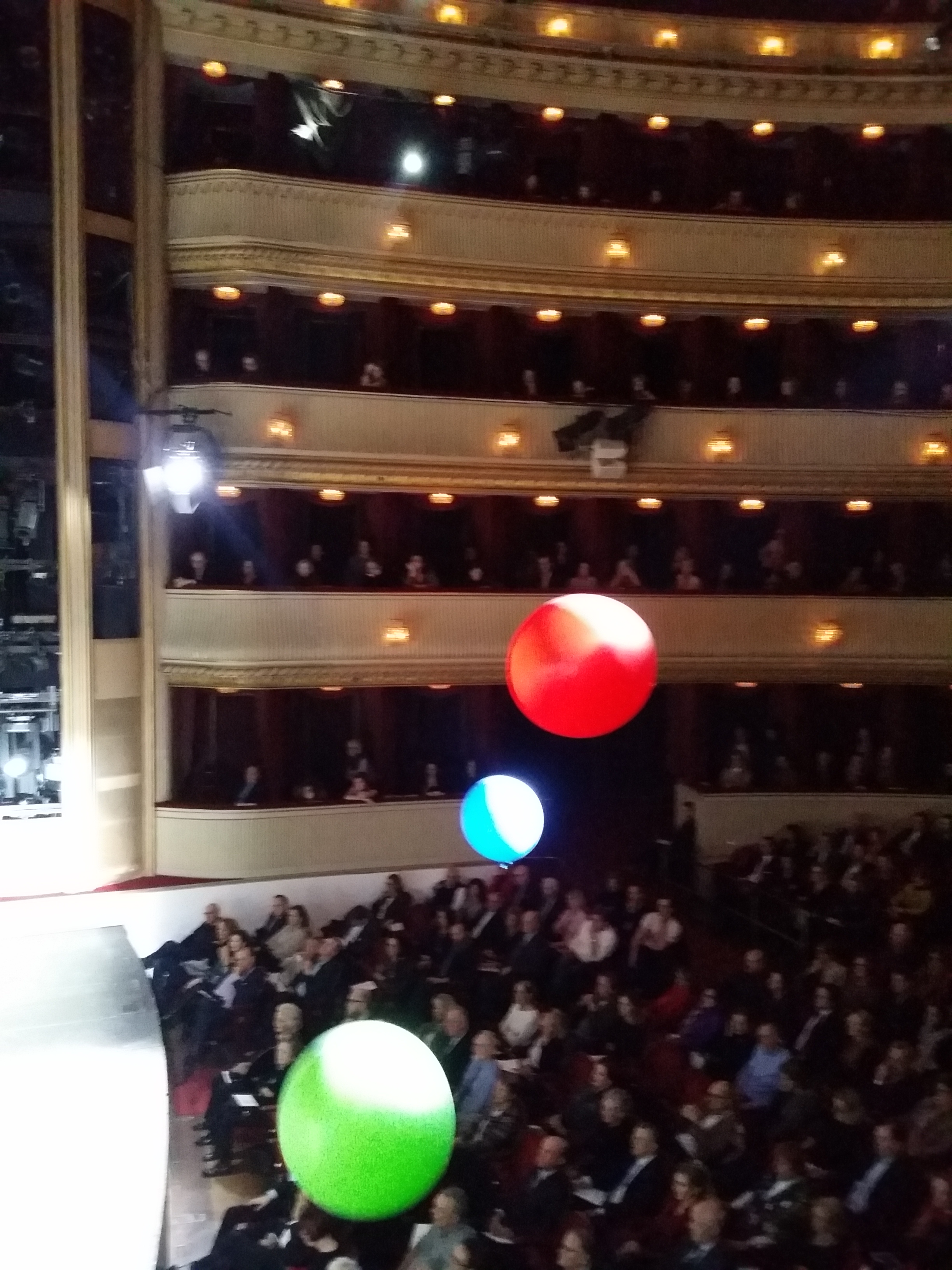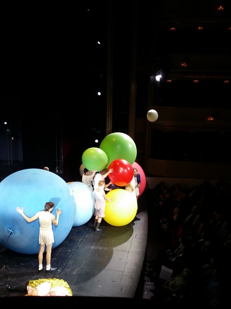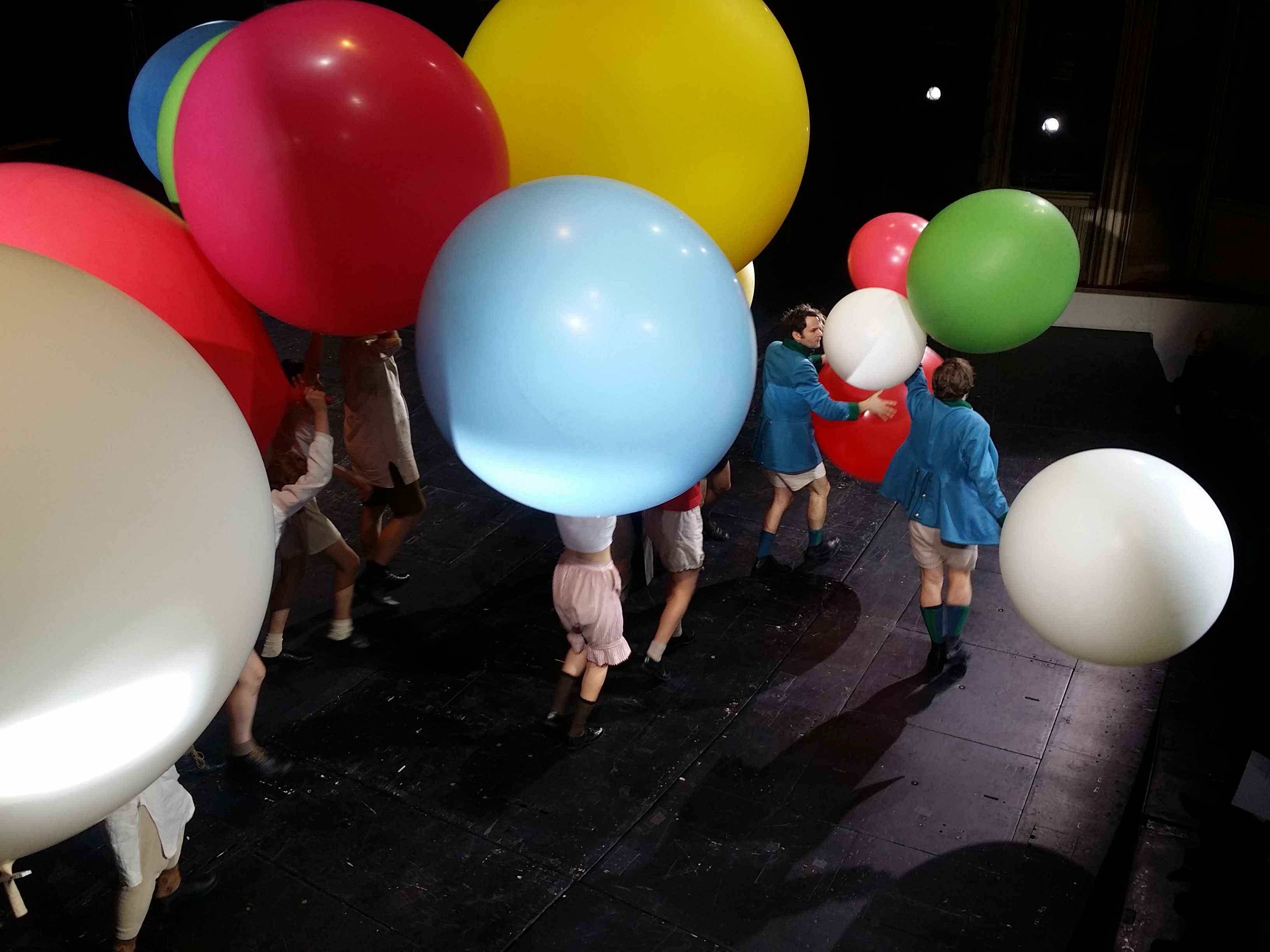 Wer gerade nicht dran ist, sitzt auf einer langen Heurigenbank an der Rückseite der sonst (fast) leeren Bühnen in Warteposition. Die Aufmerksamkeit wird aber allzu oft auf die bunten Ballons in unterschiedlichen Größen gelenkt, die teils auf der Bühne, teils im Zuschauerraum herumschweben und zur Unterhaltung des Publikums beitragen. Ja, eh lustig, aber wozu eigentlich?