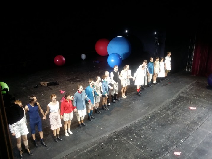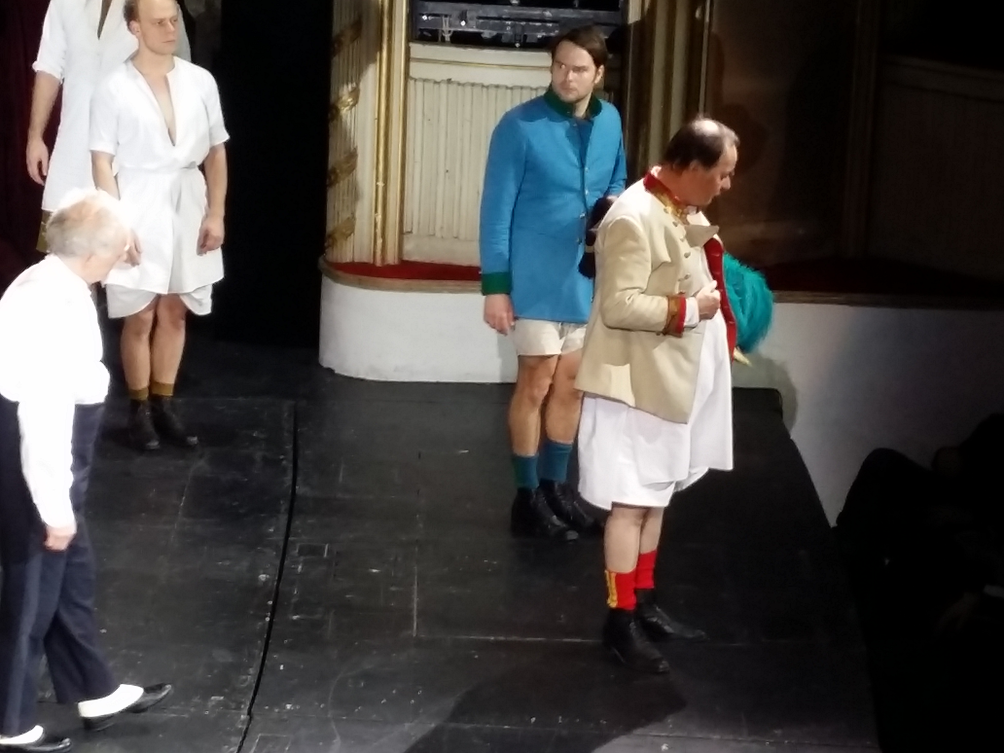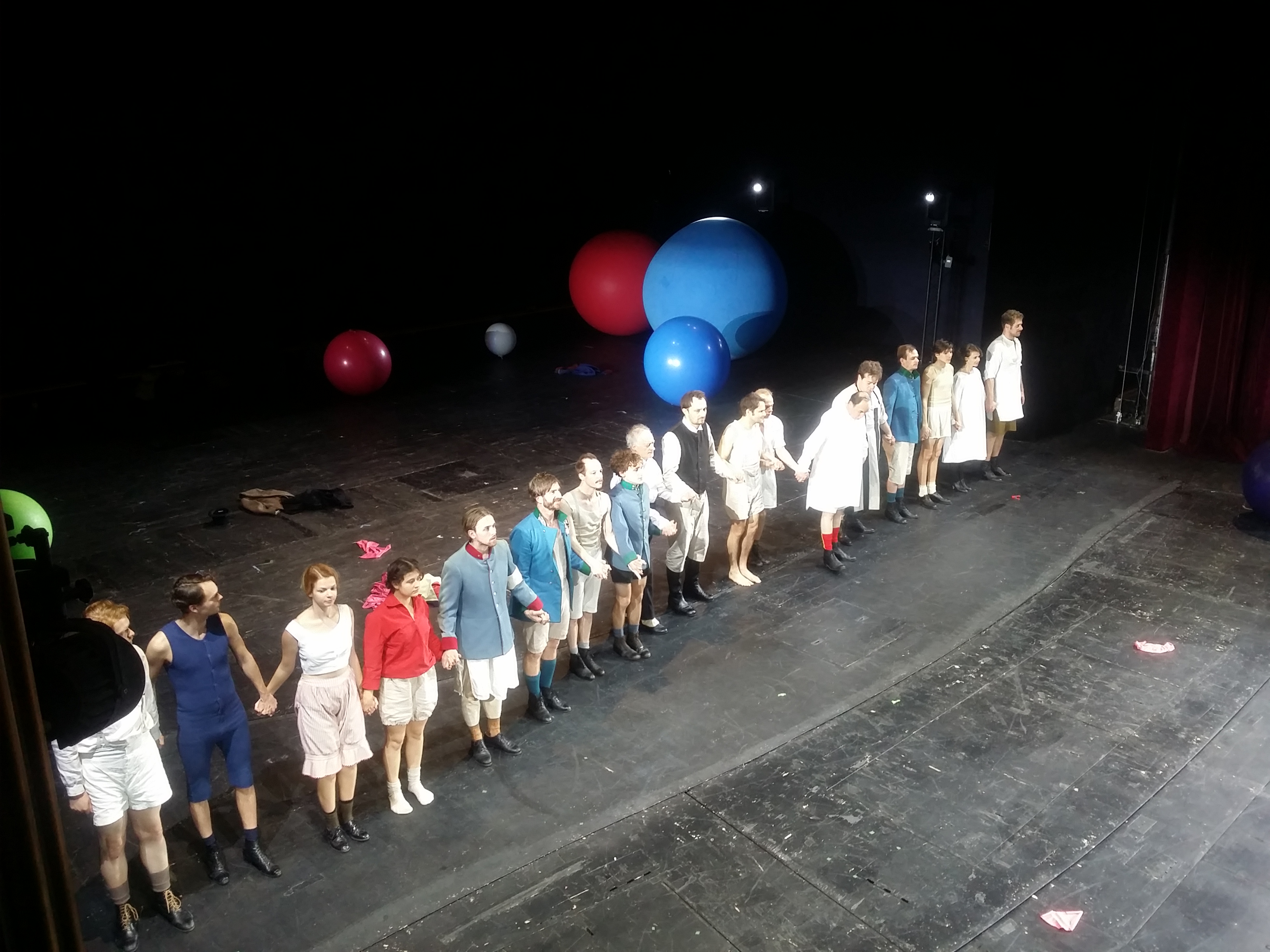Aber irgendwie kommt das Ganze nicht so richtig ins Laufen, in den 3 ½ Stunden gibt es auch etliche Längen. Woran es liegt? Sicher nicht an den 8 Schauspielern und der einen Schauspielerin, die in mehrere Rollen schlüpfen, denn es ist wieder eine große Leistung des ganzen Ensmebles. Alle tragen grundsätzlich nur Unterwäsche aus der Zeit der Handlung und ziehen je nach Figur meist ein Oberteil an – so ist gleich zu erkennen, wen sie verkörpern sollen.